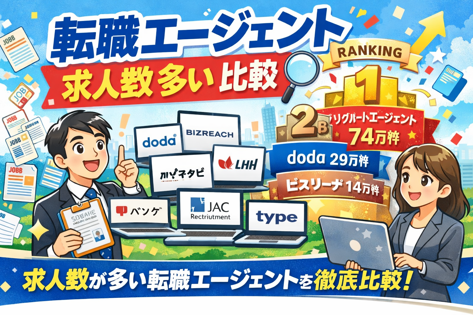 「求人数が多い転職エージェントはどこ?」と迷っている方へ。結論から言えば、求人数で圧倒的トップはリクルートエージェント(公開求人約74万件)で、次いでdoda(約29万件)、ビズリーチ(約14万件超)と続きます。本記事では主要8社の求人数・サポート力・得意分野を客観的に比較し、あなたに最適なエージェント選びをサポートします。