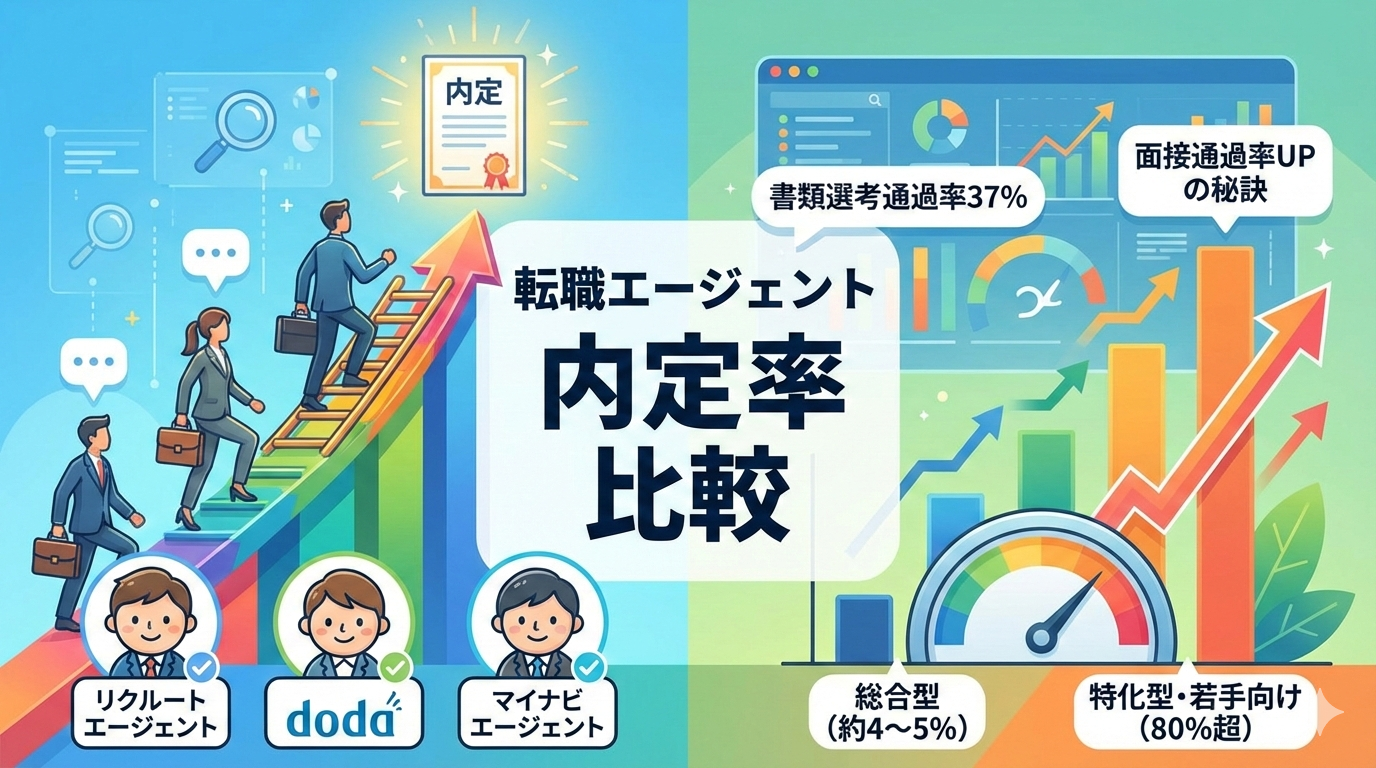 転職エージェントの内定率は各社によって大きく異なり、総合型では約4〜5%、特化型・若手向けでは80%超のサービスも存在します。この記事では、主要エージェント6社の内定率・書類選考通過率・面接通過率を徹底比較し、内定率を上げる具体的な方法まで解説します。